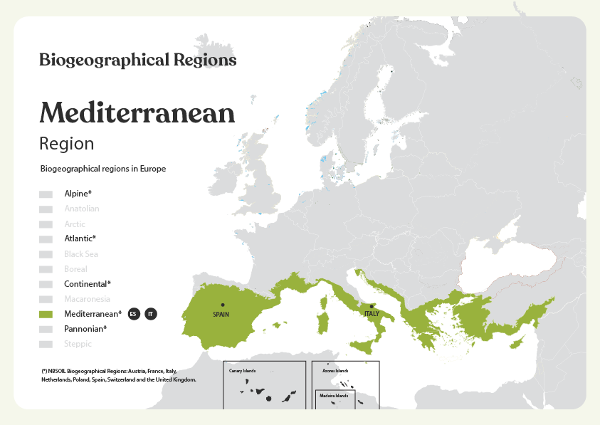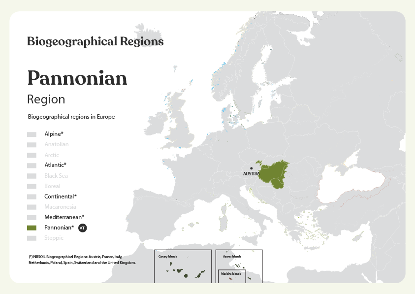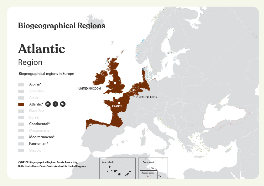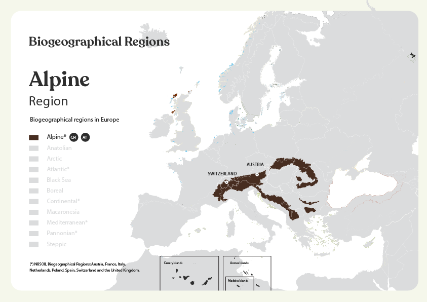 This deck contains cards for the five Biogeographical regions present in the NBSOIL consortium countries: Continental (Poland); Mediterranean (Spain and Italy); Atlantic (United Kingdom, France, and The Netherlands); Alpine (Switzerland and Austria); and Pannonian (Austria).